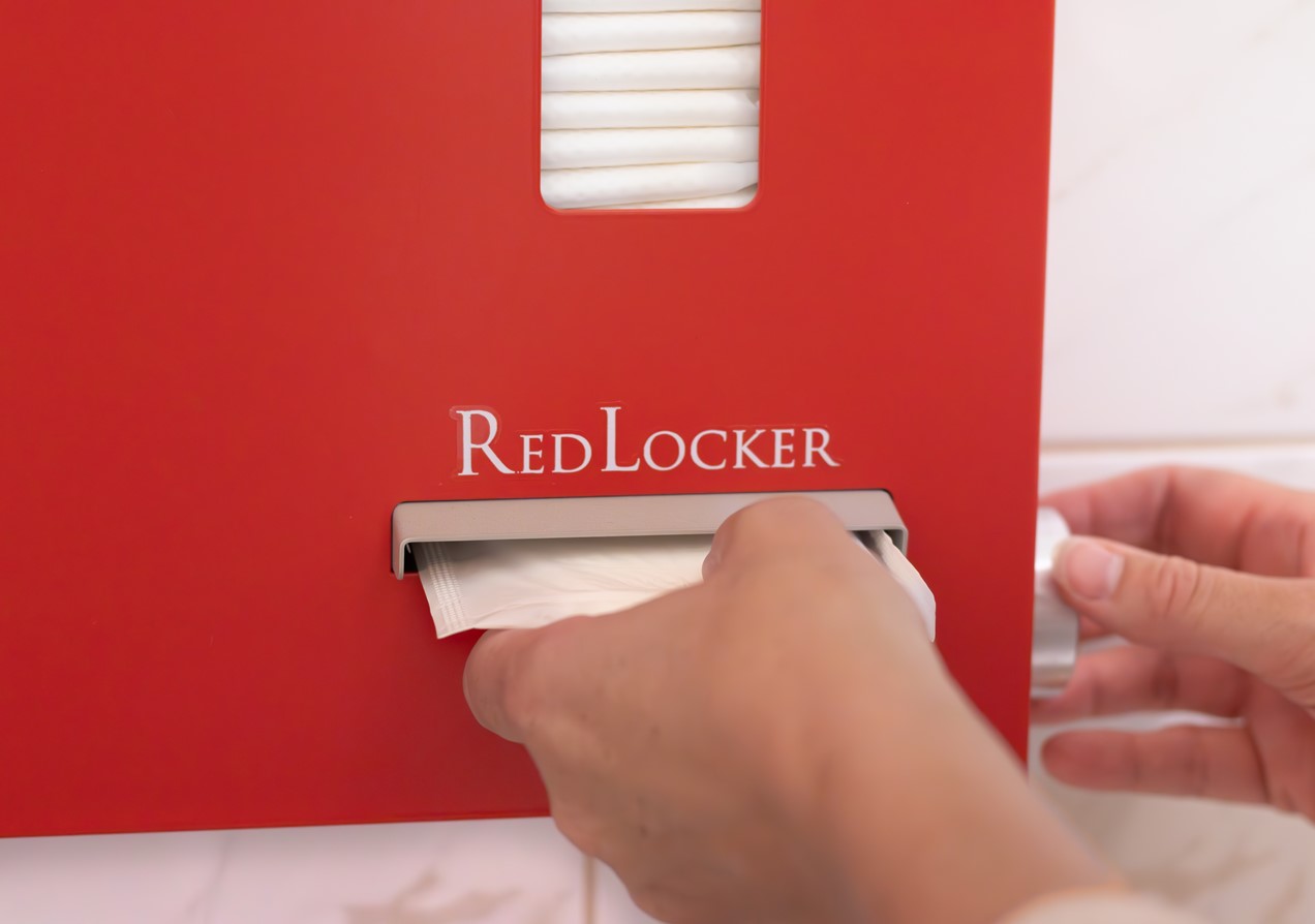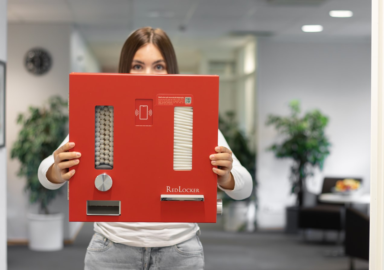 De röda automaterna som utvecklas och säljs av RedLocker syns tydligt på företagets toaletter och ska signalera att vi som arbetsgivare knyter an till de förändringsambitioner som RedLocker aktivt jobbar för i synen på ökad inkludering och smidigare hantering av mensskydd.