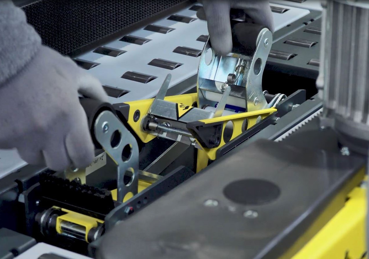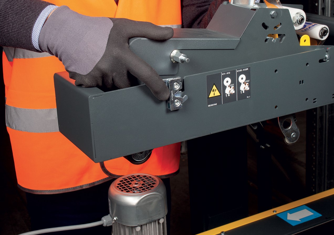 Underhåll och byte av transportband sker enkelt och snabbt, och den har ett 75 mm högt transportband för hela sortimentet, inklusive maskiner för låga lådor. Som tillval finns även ett larm för slut/bruten tejp.