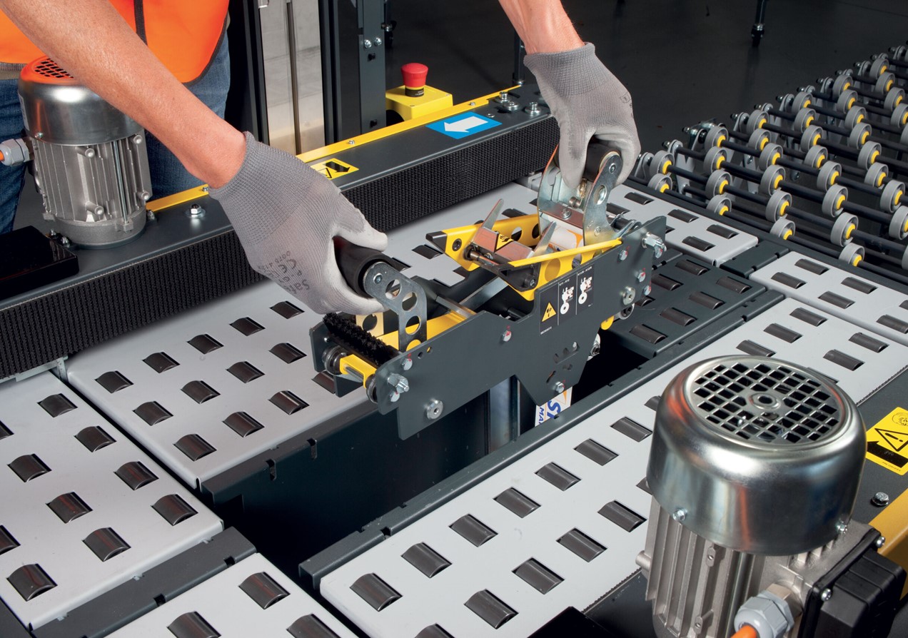 Maskinen har också en ny enhet med snabbkoppling för tejphuvuden, både upptill och nedtill, vilket gör verktyg överflödiga. Underhåll och byte av transportbandet är enkelt och snabbt. Transportbandet är 75 mm högt och passar hela sortimentet, inklusive maskiner för låga lådor. Ett larm för slut eller bruten tejp finns som tillval.