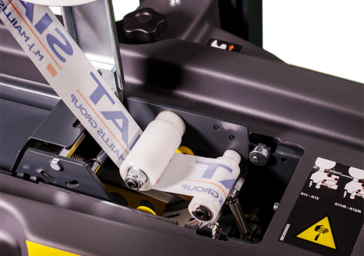 Maskinen har pneumatisk justering av kartongens bredd och höjd, och kan utrustas med antingen K11R (50 mm) eller K12R (75 mm) tejpenheter.