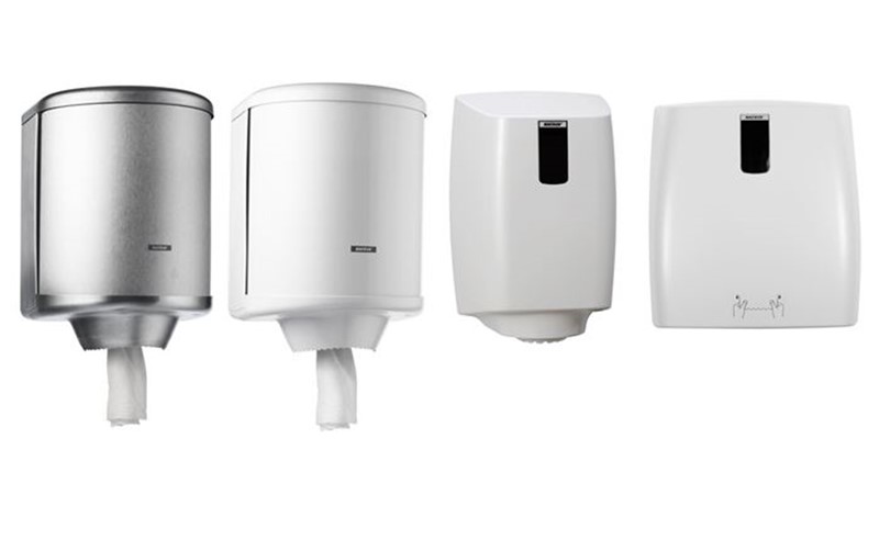Handduksskåp i metall för tuffare miljöer. Katrin dispenser i plast som är väldesignade och har tekniska lösningar som gör att förbrukningen minimeras.